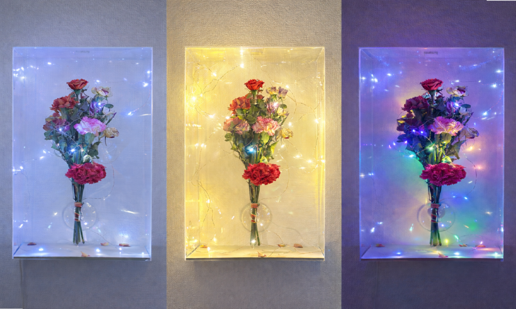 株式会社In-cloverが保有する「実用新案登録第3254430号」壁掛けコレクションケース「BE@COLLE(ベアコレ)」を花の展示用途として活用したフラワーディスプレイ提案です。