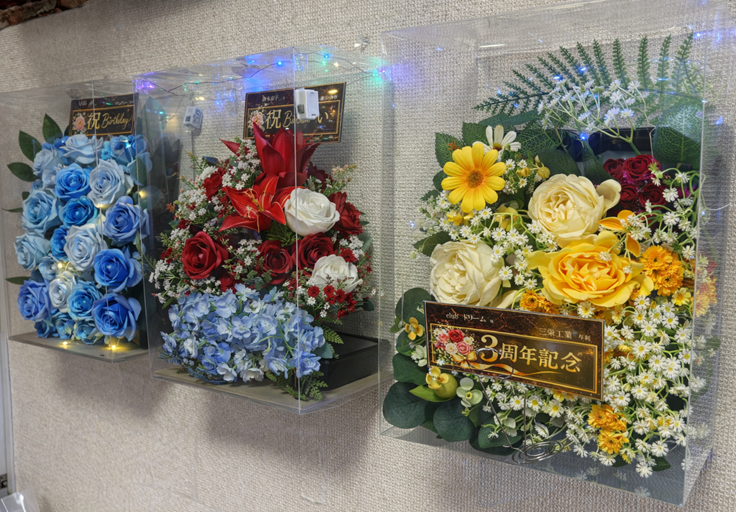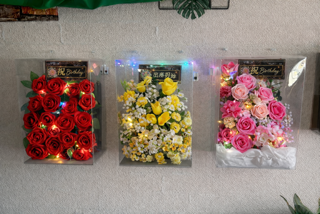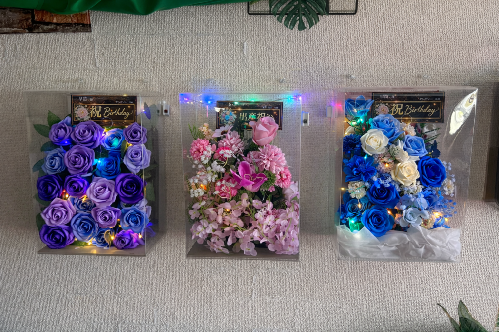 花の展示用途として活用したフラワーディスプレイ提案です。実用新案申請済み NZ2512080 実願2025-003263